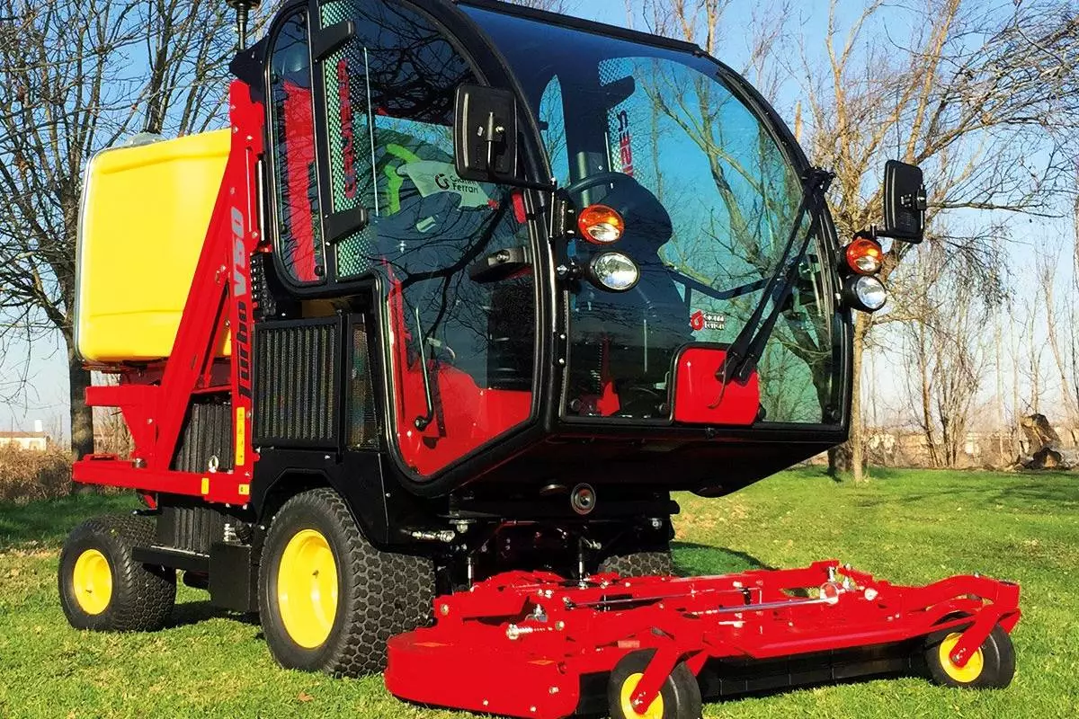 Turbo V50 professionell gräsklippare / grönytemaskin för stora ytor utrustad med en Kubota 4-cylindrig 50 HK dieselmotor med partikelfilter som garanterar enastående prestanda under alla arbetsförhållanden. Tack vare en 1300 liters gräsuppsamlare är den idealisk för dem som söker kraft, effektivitet och tillförlitlighet på stora grönområden.